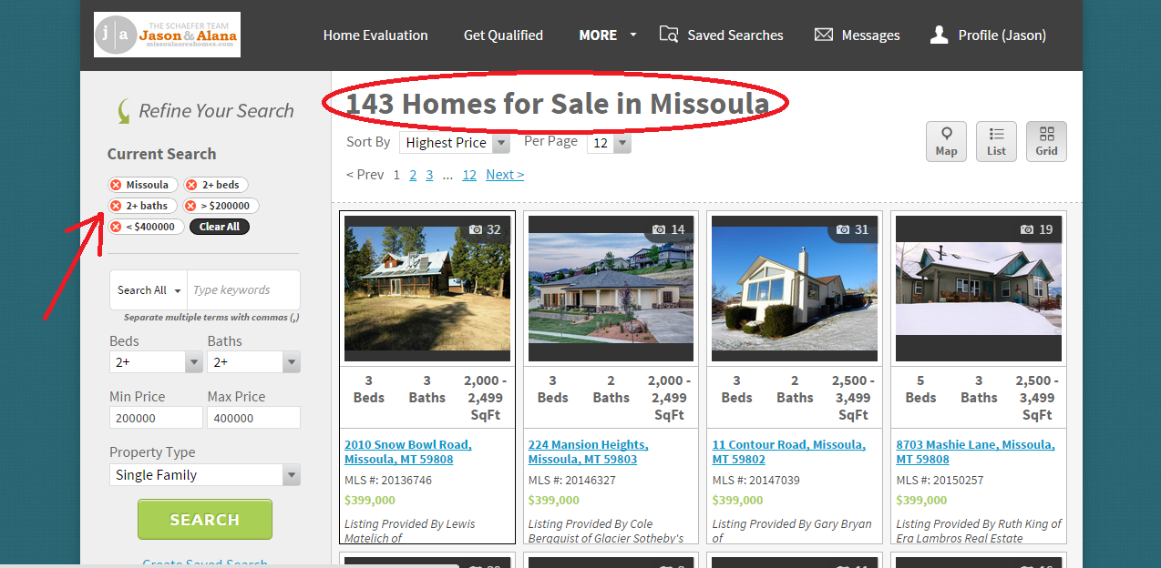 Let's begin with our initial search - I did Missoula, $200,000-$400,000, single family homes with 2 bed/2 bath. Below you can see the results of this search with 143 homes for sale in Missoula: