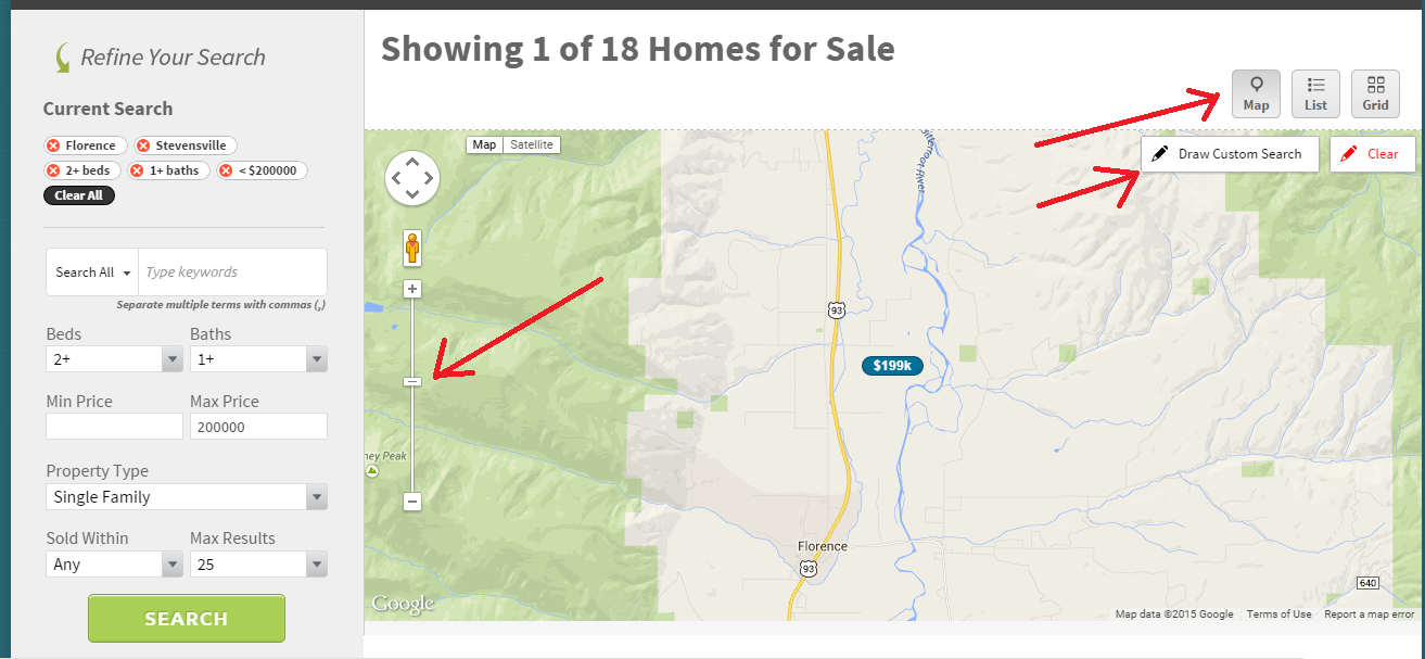Here's the 1st example. I used a search criteria of Florence & Stevensville - 2 bed/1 bath, under $200,000 and single family homes. You can see the initial search comes up showing 1 of 18 homes. There are 3 red arrows drawn showing on this screen shot. To get into Map Search, simply click on it after you've put in the parameters above. There's a second arrow drawn to Draw Custom Search, which we'll look at next. The final one is the Zoom In/Out vertical bar on the left hand side.